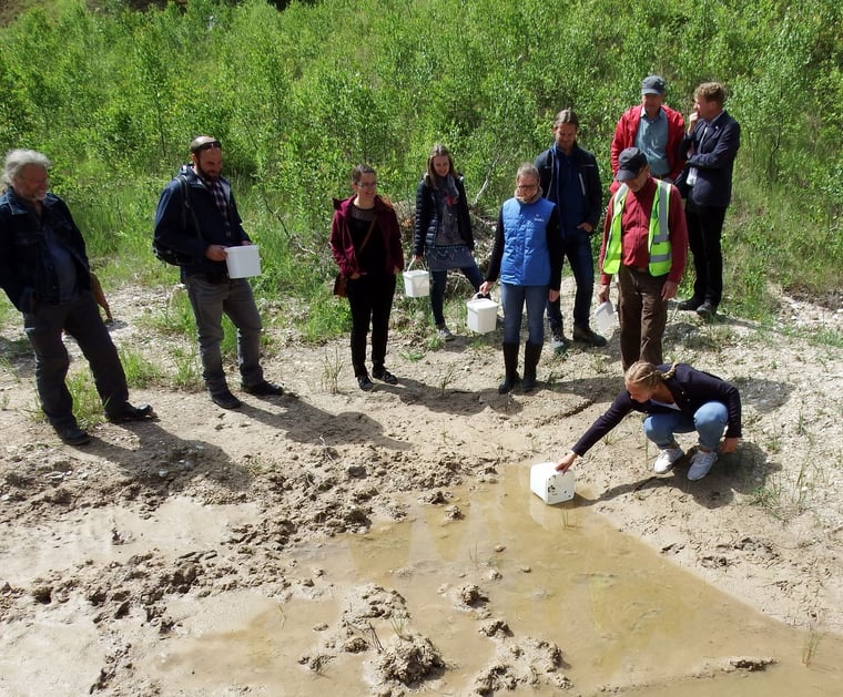 Tettenborn Kolonie. Es ist so weit. Nach der umfangreichen Maßnahme im Februar konnten am 10. Juli 2019 die ersten jungen Gelbbauchunken bei bestem Wetter ihre neue Heimat im Lohoffschen Bruch südlich von Bad Sachsa beziehen. Zu der Wiederansiedlung in dem ehemaligen Gipssteinbruch waren insgesamt 21 Gäste gekommen, darunter Projekt- und Kooperationspartner von LIFE BOVAR, VertreterInnen der zuständigen Behörden und örtlichen Naturschutzverbände sowie interessiere BürgerInnen. ,,Wir möchten uns bei allen Beteiligten bedanken, durch deren Unterstützung es heute möglich ist, der gefährdeten Gelbbauchunke hier ein neues Zuhause bieten zu können‘‘, so Holger Buschmann, Landesvorsitzender des NABU Niedersachsen.