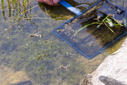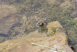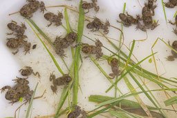 Auch unsere Gelbbauchunken schritten hier direkt zur Fortpflanzung. Die Larven werden bis zur Metamorphose unter natürlichen Bedingungen gehalten. Dann kommen die Jung-Unken zurück in die Gebiete und werden in die mit LIFE BOVAR angelegten Gewässer in die Natur entlassen. Vorteil dieser Methode ist die hohe Erfolgsquote: da es quasi keine Prädatoren in der Zuchtstation gibt, schlüpft ein Großteil der Eier und die Larven schaffen die Entwicklung bis zur Metamorphose. Insgesamt konnten bisher 384 Gelbbauchunken in die Freiheit entlassen werden – langfristig wird hierdurch die Population gestärkt und die Unken können auch die neu entwickelten Lebensräume besiedeln.