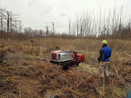 Zur Landschaftspflege wurde ein Raupen-Mulchgerät angeschafft. Hiermit werden zukünftig schwer zu pflegende Lebensräume wie Hangflächen und nasse Niedermoore gepflegt. Das neue Gerät wurde direkt im Muckenbruch (Projektgebiet NRW 5) erfolgreich eingesetzt um stark aufwachsende Vegetation zu mulchen. Auf der entstandenen Offenfläche werden bald neue Kleinstgewässer für die Gelbbauchunke angelegt.