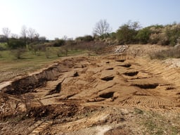 Mit der Baggerschaufel wurden in den zuvor eingebauten und verdichten Lehm die kleinen Tümpel angelegt. Das steinige Aushubmaterial sowie eingebrachter Kalkstein (Vordergrund) bildendenneu geschaffenen Landlebensraum
